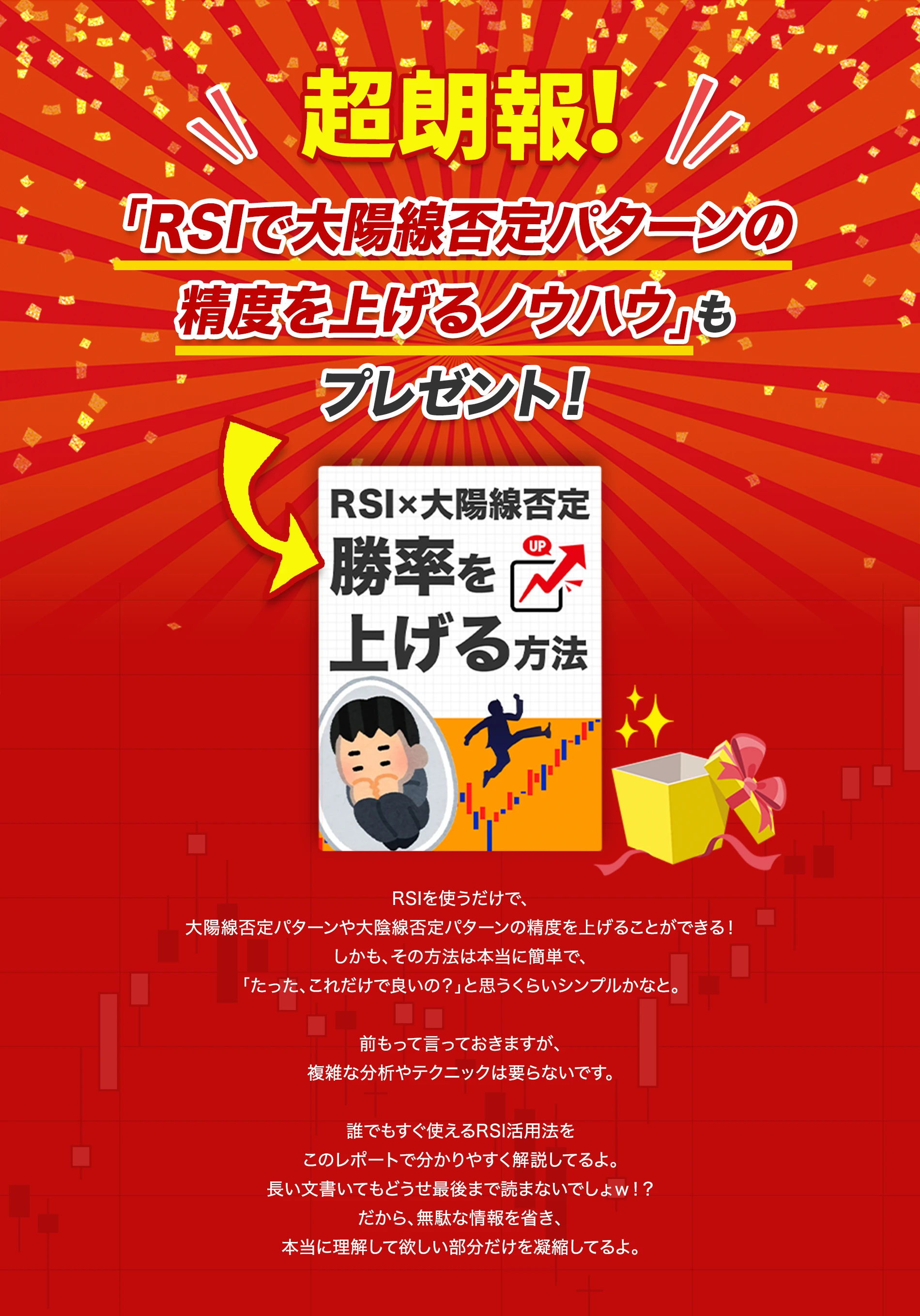 以前にFXTFから「大陽線・大陰線否定アラート」をもらった方は、当時FXTFからもらったダウンロードリンクに再アクセスすれば、RSIで大陽線否定パターンの精度を上げるノウハウをGET出来ます!